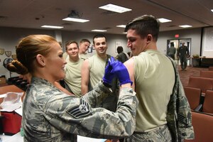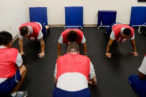 U.S. Air Force Airmen assigned to the 916th Air Refueling Wing conduct their fitness assessments at Seymour Johnson Air Force Base, N.C., Nov. 5, 2017. The fitness assessment ensures Airmen are fit to fight by testing them on three components, body composition, aerobics, and muscular fitness. (U.S.