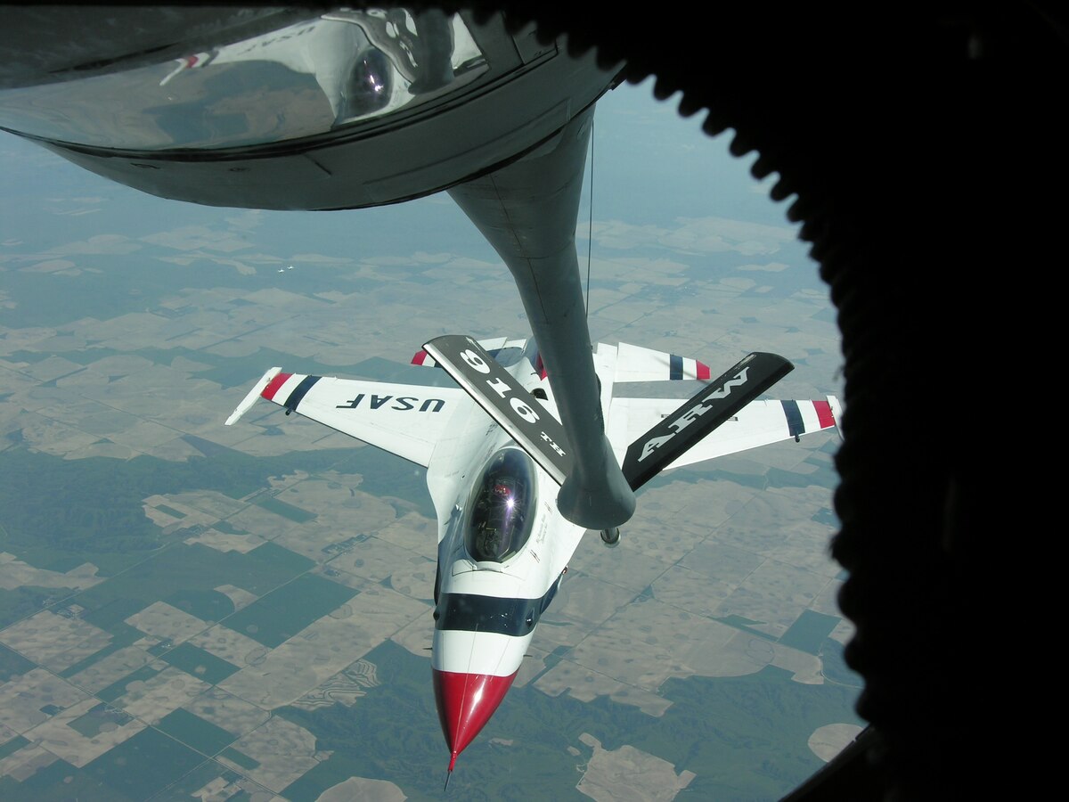SEYMOUR JOHNSON AIR FORCE BASE, N.C. -- On a beautiful day in early June a KC-135 Stratotanker from the 916th Air Refueling Wing, Air Force Reserve, refuels a plane from the Air Force's aerial demonstration team, the Thunderbirds. The F-16 Fighting Falcon took on fuel over the Chicago area after finishing an airshow in Davenport, Iowa.