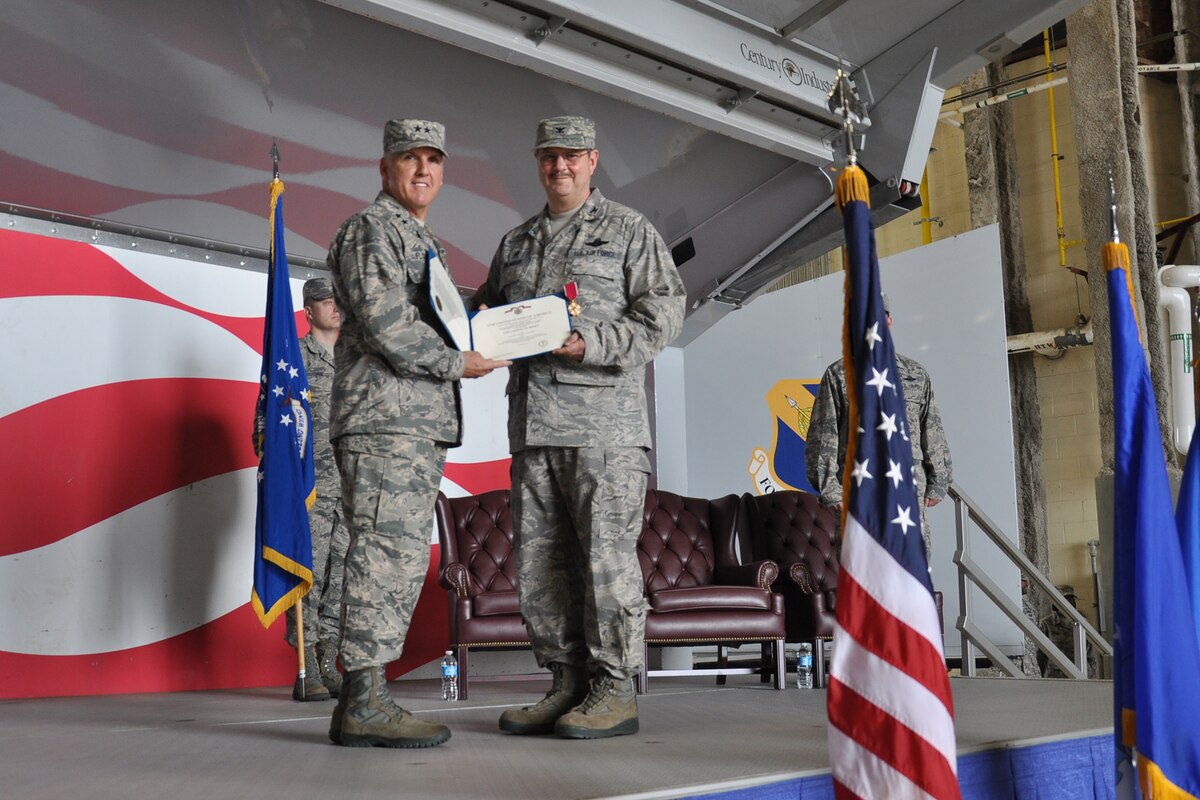 Maj. Gen. John C. Flournoy, Jr., 4th Air Force commander, presents departing 916th Air Refueling Wing Commander Col. Gregory Gilmour, the Legion of Merit at the wing's change of command ceremony, Seymour Johnson Air Force Base, North Carolina, April 18, 2015.