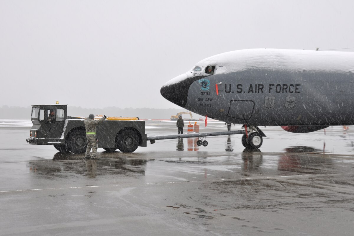 916th Maintenance Group personnel work through wintry conditions to get a KC-135 Stratotanker towed into a dry hangar at Seymour Johnson Air Force Base, North Carolina, Feb. 24. Personnel who assisted the flightline effort included Tech. Sgt. Michelle Guntor, Staff Sgt. Daniel Frye, Staff Sgt. Kristopher Noble, Staff Sgt. James Kelley, Staff Sgt. Jerimias Ramos, Staff Sgt. Jason Lechot and Senior Airman Baker Boone.