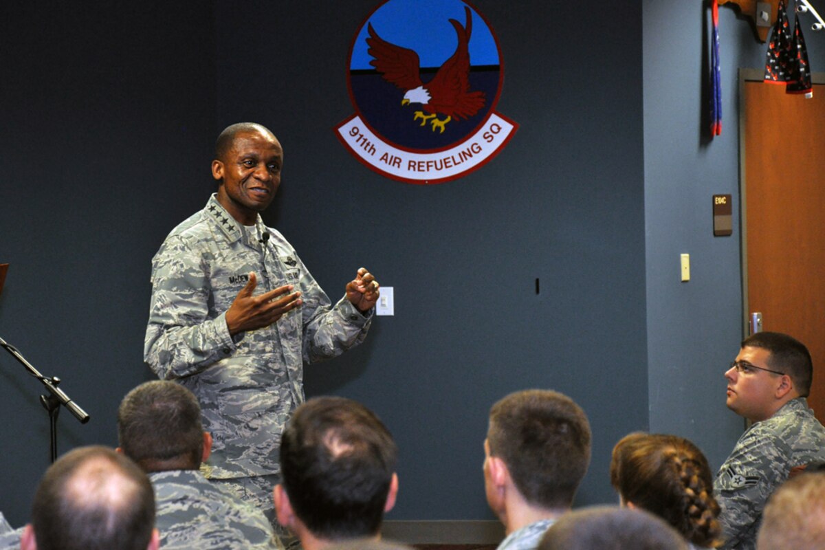 Chief Master Sgt. Victoria Gamble, Air Mobility Command command chief, Chief Master Sgt. James Loper, 916th Air Refueling Wing command chief, and Chief Master Sgt. Dallas Turner, 911th Air Refueling Squadron chief enlisted manager, talk while walking near the 916th ARW ramp, Seymour Johnson Air Force Base, North Carolina. Gamble accompanied Gen. Darren McDew, AMC commander, during his visit to the base to meet the Airmen of the 916th ARW and its Total Force Associate partner, the 911th ARS, Sept. 23, 2014. (USAF photo by Staff Sgt. Alan Abernethy, 916ARW/PA)